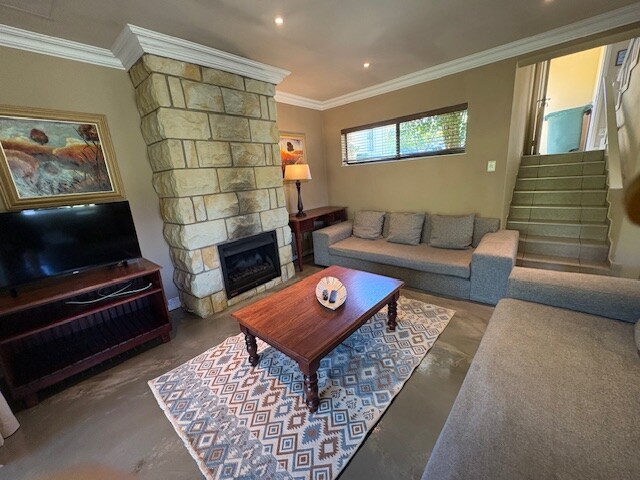 Glen Eagles 1 + Cottage (2 separate units) can accommodate 6 guests and is a cyclist/MTB friendly property with a bicycle shed,e-bike charging station and washing bay.Units are equipped with a solar system. NO LOADSHEDDING! Bedroom 1 and 2 can accommodate 4 guests. The cottage has a separate external entrance with a queen size bed, open plan bathroom (with a shower) and a small kitchenette. The open plan living / dining area at each unit has sliders to a large patio with a built-in braai.