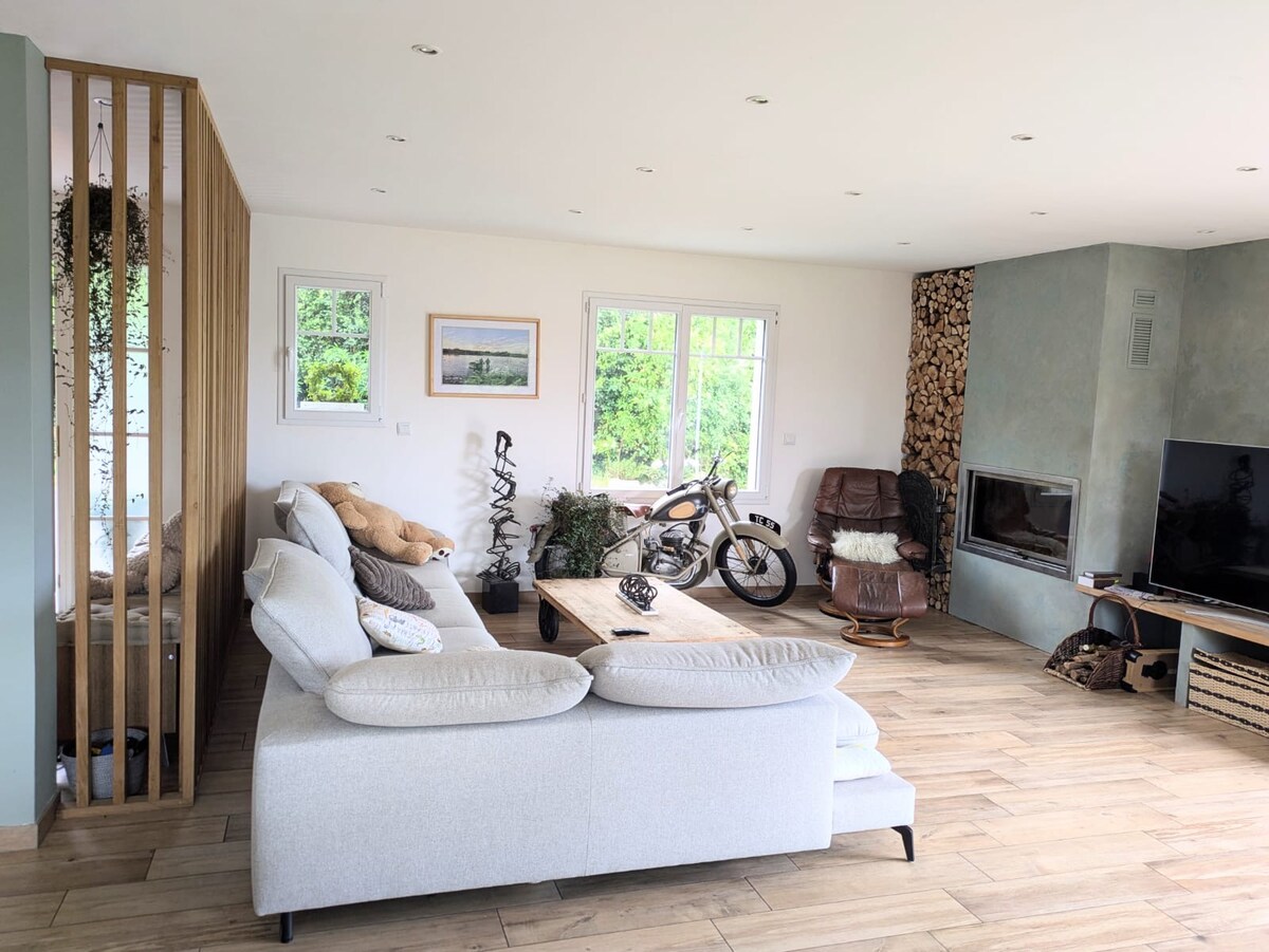 Grand maison individuelle de campagne avec une piece de vie de 70m2. Parfait pour tout la famille. Le salon dispose d'un grand canapé confortable, d'une table basse, d'une cheminée avec un fauteuil en cuir à côté, d'une grande table à manger et d'une cuisine ouverte. La maison est très spacieuse et lumineuse, joliment décorée de fleurs et d'objets d'art. Il y a une terrasse avec un barbecue et une table pour 6 personnes. La maison est isolée des voisins. Grand jardin avec aire de jeux.