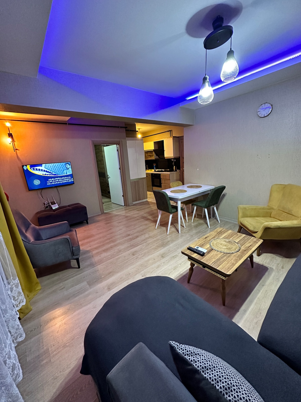Relax with the whole family at this peaceful place to stay. Inside a residential complex, a room and a large living room. Inside the complex, there is a covered summer and winter swimming pool, a gym, a Turkish bath, a private garden, a parking garage, 24/7 security, near the bus station, supermarket, and restaurants