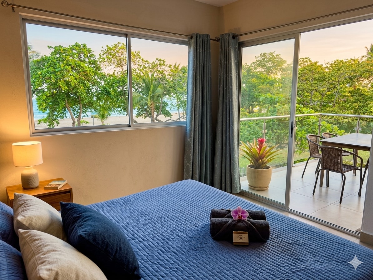 PREMIUM BEACHFRONT condo in Blue Flag Beach Bejuco, Costa Rica. Coastal Charm in this Stylish Condo This luxurious two-bedroom, two-bathroom condo captures the essence of coastal living. Get lightning-fast WiFi with fiber optic speeds up to 300 MB. Overlooking the shimmering pacific ocean, this residence is in a secure gated community. This beachfront condo offers a serene retreat amid abundant wildlife, complemented by ocean breezes and the soothing sounds of crashing waves.