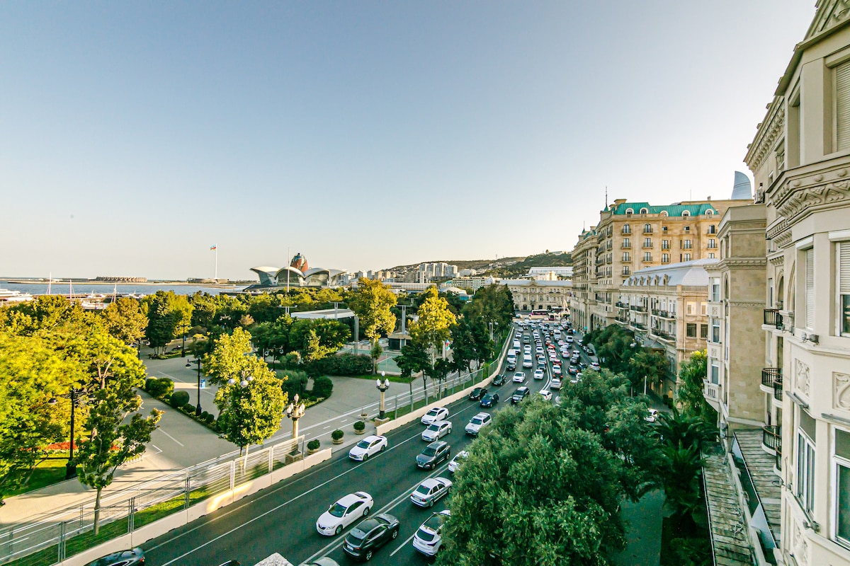 Wake up to stunning sea views and unwind with magical sunsets from the balcony. This modern complex/apartment is 15 minutes from Baku’s center by car and 25 minutes from top beaches. Just a 5-minute walk away, there's a bus stop with modern, air-conditioned and electric buses that reach downtown in 25–30 minutes via a dedicated, traffic-free lane. Enjoy fast Wi-Fi, a full kitchen, king-size bed, PS5, and 24/7 building security with cameras—perfect for couples, travelers, and remote workers.