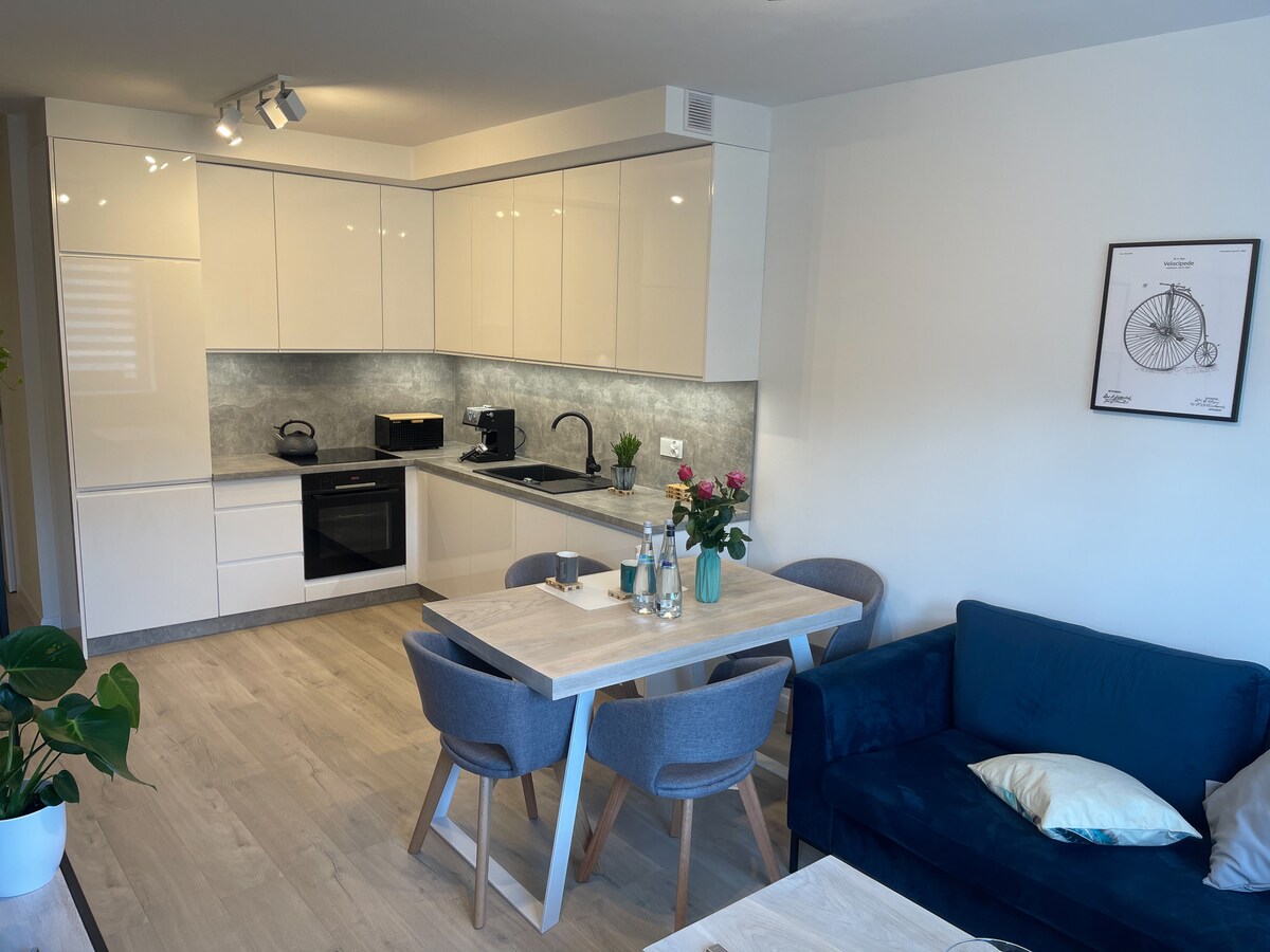 The apartment is located in Biłgoraj, on the picturesque Roztocze. It has a bedroom with a large double bed, a desk and a spacious built-in wardrobe. Two additional large built-in wardrobes are located at the entrance. It has a balcony with a set of furniture. It is fully equipped with, among others: - a kitchenette with a dishwasher, fridge, oven, coffee machine and necessary kitchen accessories, a set of dishes and cutlery - 60'' TV and high-end sound system - washing machine, clothes dryer.