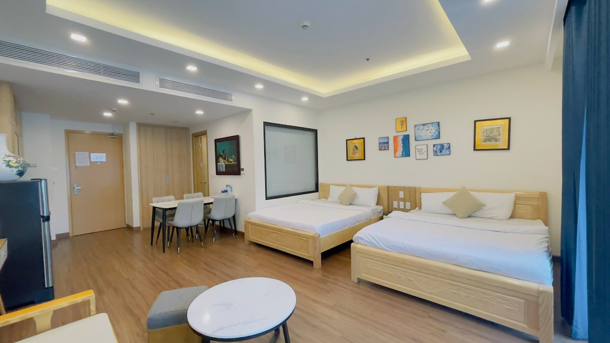 1+ Bedroom Sea View Apartment with luxurious interior and great view on the 25th floor at TMS Quy Nhon: - Large area: 60 m2 - Fluffy and soft mattress with 4-star hotel standard bedding - Smart TV with high speed Internet (upload/download: 150Mbps) - Fully equipped kitchen, fridge, microwave - Rooftop access - Pay per use amenities: pool, gym & spa - On the beach - Centrally located Suitable for families and groups of 4 people or more that like to cook and enjoy larger spaces.