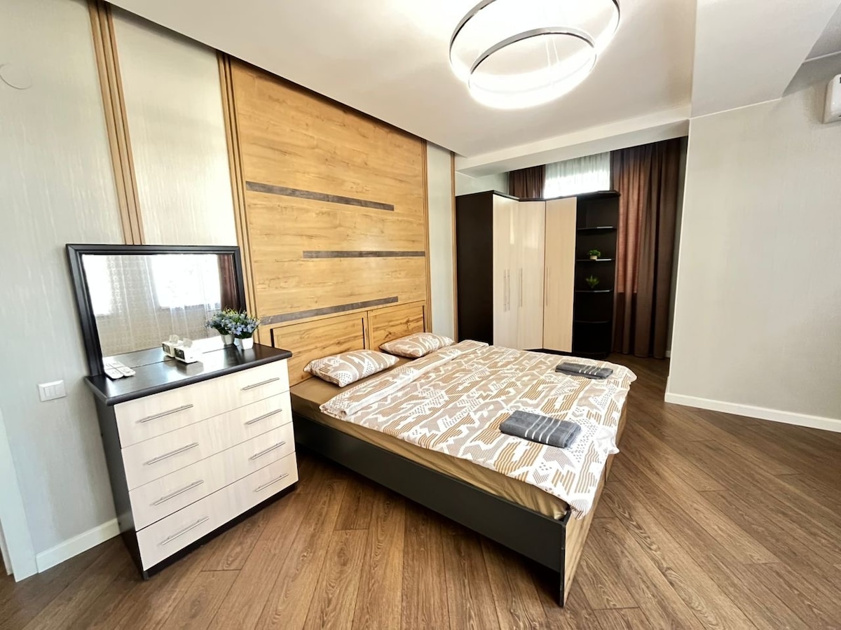 Cozy, Luxury Apartment for a comfortable stay in the freshly made Elite House located in the city center. The house is striking both day and night. At night, the building shines very beautifully, can be seen even from a long distance. On the ground floor of the building, there is a 24/7 supermarket & pharmacy, GYM, beauty salons, bank. The apartment is very bright and comfortable with all amenities. The building is safe and guarded around the clock, there is also a playground on the territory.