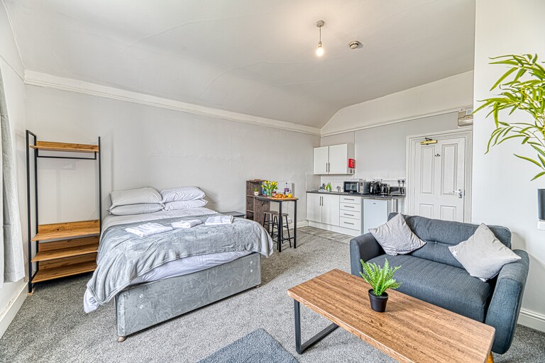 Modern, self-contained garden room with everything you’ll need for an enjoyable stay in our lovely city! THE SPACE Light and sunny room with a comfortable double bed. There’s a wall-mounted TV with sound bar and plenty of storage. There’s also a small breakfast bar with stools, a well equipped kitchen area and a shower room. The property is 15 mins walk from the centre of historic Chester and 5 mins from a supermarket/pharmacy and Bache station (on Chester-Liverpool line)
