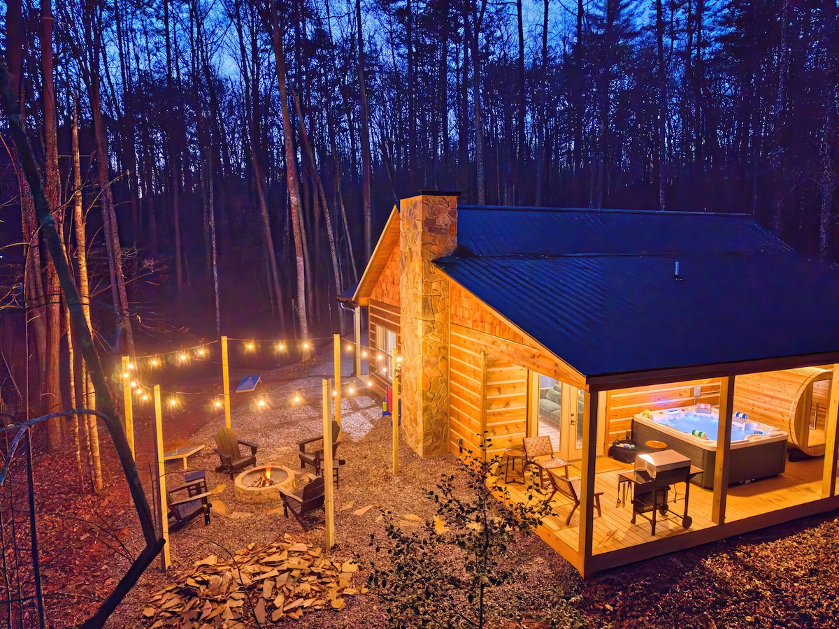 Relax in style at this modern cabin nestled between Helen and Dahlonega. Close to wineries, hiking, fishing, and shopping. Enjoy over an acre of privacy, a spacious deck, and upscale furnishings. Perfect for two couples or a family, with two king bedrooms featuring en suite baths, TVs, and large windows. Extra-long bunk beds comfortably sleep adults or teens. Paved road and driveway make for easy access. The perfect North Georgia getaway! STR-23-0073 Business lic 4767