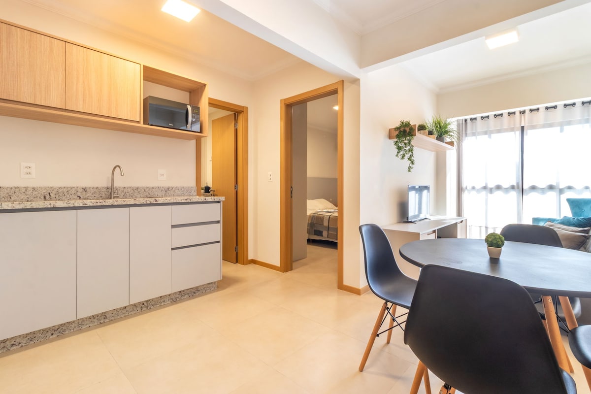 27 m² Studio | double bed | work bench | Smart TV/IP | 300M internet | air conditioning | dryer | microwave | induction stove | sink | refrigerator | kitchen utensils. Integrated environments: living room, bedroom, kitchen, bathroom, workspace and dining area. Furnished and equipped apartment, on a high floor, overlooking the sunset. In downtown Blumenau, with private garage in G2, swimming pool, sauna and gym. The building has a paid laundry and a self-service supermarket.