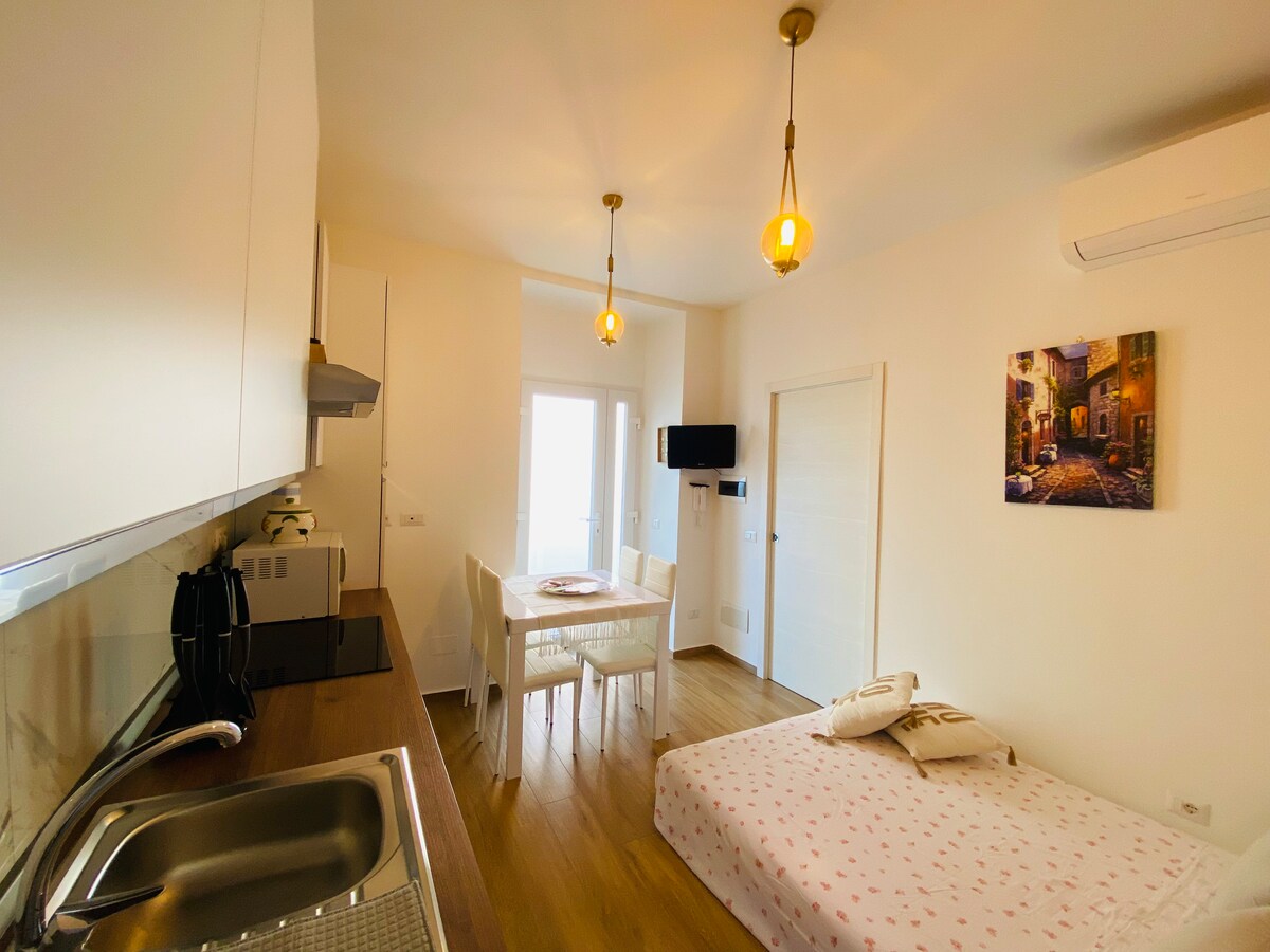 Recently renovated one-bedroom apartment located on the third floor without a lift. Living room with sofa bed and TV, fully equipped kitchen, bedroom, bathroom and terrace. Strategic location with all services nearby, perfect for visiting the many attractions and enjoying the sea. Equipped with every comfort necessary for a relaxing stay, including bed linen, towels, Wi-Fi and air conditioning. No dedicated parking, but there are free and paid parking spaces nearby.