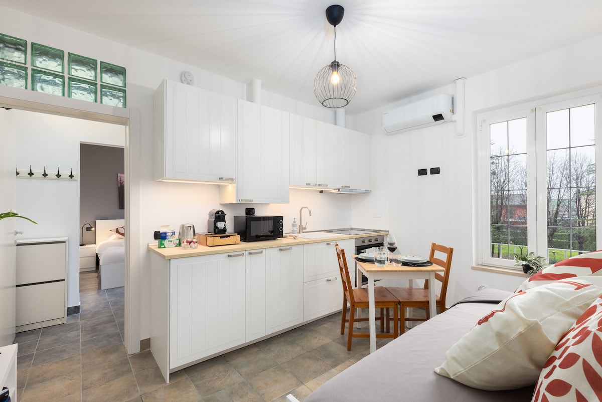 Cozy and modern two-rooms apartment with private parking and garden. The apartment is located on the ground floor of a building in the historic centre of Bonate Sopra; it has an independent entrance. Furnished with design details and industrial flooring, it has a spacious living area with kitchen, dining table and sofa-bed. Room with queen size bed, bathroom and washing machine. Ideal to reach Bergamo and its airport, Milan, and Italian lake district. Please note: no TV, no air conditioning