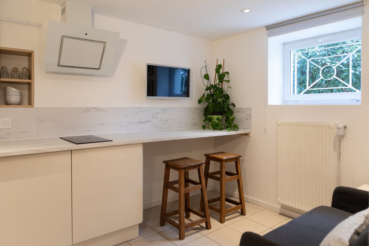 WELCOME! Located on the banks of the Loire, on the right bank, this cocoon offers direct access to hiking trails. You will surely be seduced by the completely independent entrance and terrace! Equipped with a kitchen (fridge, microwave, stove, coffee maker, kettle, toaster...), it has a separate bathroom and toilet, a beautiful bedroom for 2 people with a seating area as well as a surprising reading area/view of the Loire and its green setting: "above the garden"