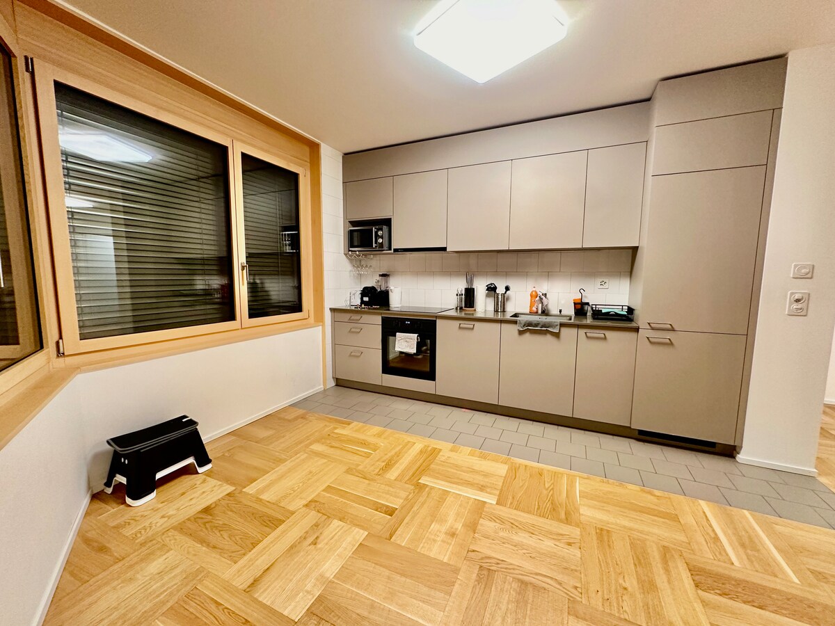 A beautiful large and bright apartment, quiet, comfortable and welcoming. close to the center and well connected by public transport, 2 bedrooms, 2 living rooms, 1 large balcony, 1 bathroom, beautiful living rooms. 2 double beds and possibility to add 2 extra mattresses. Parking on the street (always space) or 15 CHF per day; otherwise covered parking space possible (about 20 CHF/day depending on length of stay and availability). We look forward to hosting you!