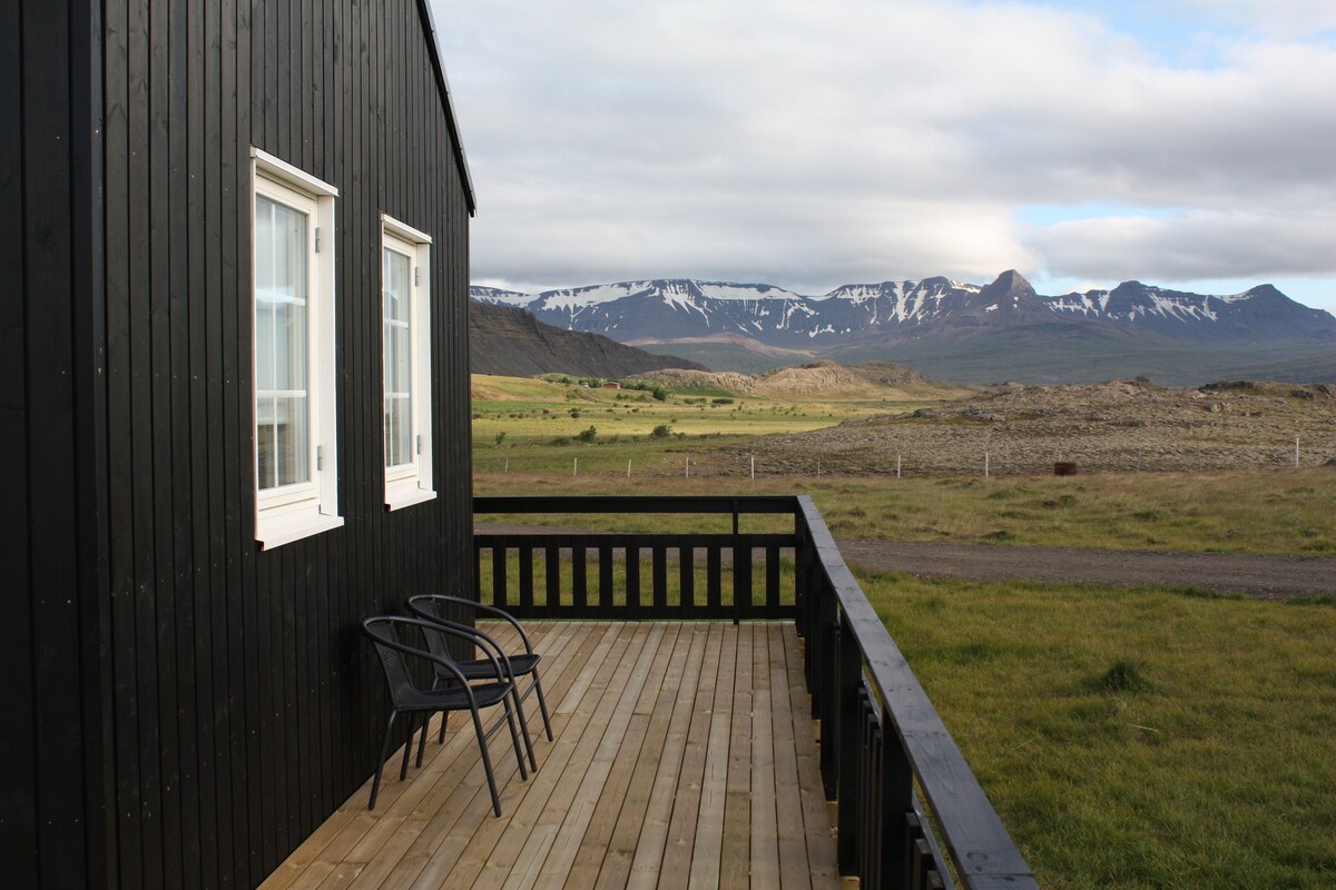 New black "old style" lodge with a beautiful mountain view. Only one hour drive from Reykjavík. Our lodge is in perfect location for exploring west Iceland, a spectacular natural wonder such as beautiful waterfalls, glaciers, lava cave and the most powerful hot spring in Europe. A quiet place to see the Northern lights during winter time (if conditions are optimal). Part of the year, depending on the season, you have animals as neighbours such as sheep and horses.
