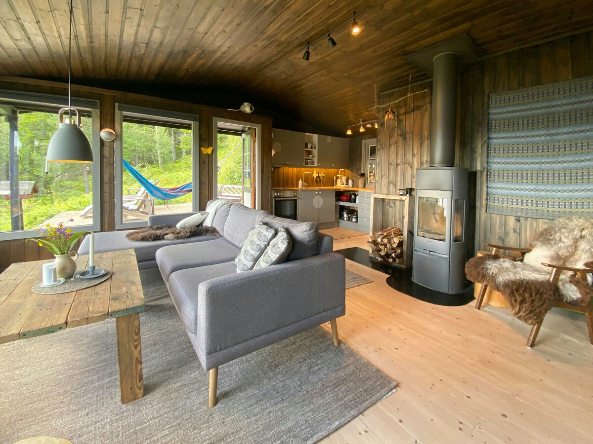 Newly built modern year-round cabin at Bortelid camping to a high standard. Sunny patio with sun from early afternoon to late night in summer Cross-country skiing opportunities right outside the cabin and short distance to alpine facilities in winter and swimming area in summer. Water, sewage, and electricity TV, Chromecast and Fiber Living room with open plan kitchen, bathroom with toilet and shower, bedroom 1 with double bed and roof hanging TV and bedroom 2 with two bunk beds