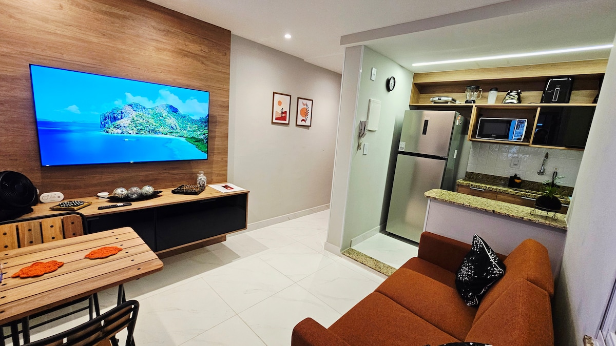 Enjoy a stunning and unique view of both the ocean and the mountain in a centrally located 2 bedroom renovated apartment in Leme, Copacabana ideal for families and couples. The apartment is cozy and has everything you need to make you feel at home. A very spacious and stylishly decorated living room, and a fully equipped apartment. One bedroom has a queen bed, the second bedroom has 2 single beds, and there are 2 more mattress/futons that can be placed in the living room if needed.