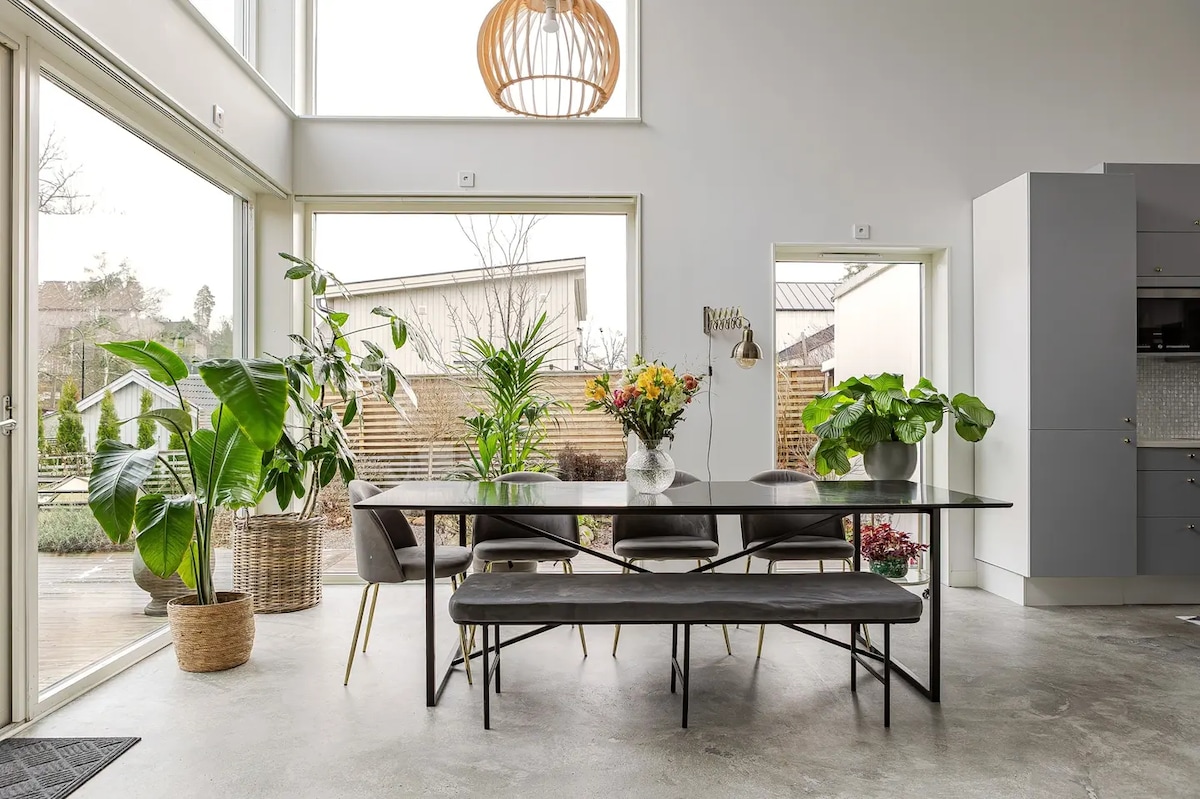 We rent a spacious, bright and fully furnished 1 bedroom apartment of 52sqm in our house from the 70's. The apartment has its own entrance and is completely renovated with fine modern materials. The entire apartment is equipped with underfloor heating under the light gray concrete floor which extend through the entire apartment. New modern kitchen from Ballingslöv with everything you need to cook for one or more people. The apartment has an open floor plan.