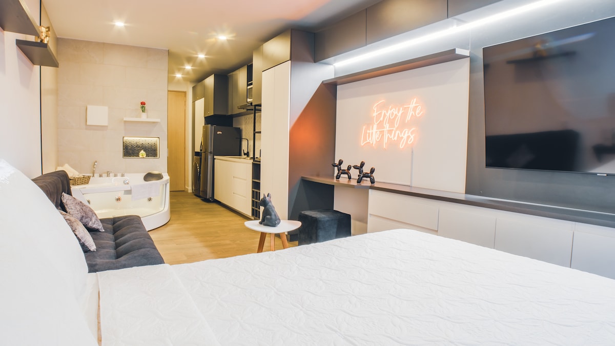Enjoy a modern and super cozy apartment studio, in a new building. Fully equipped, with a beautiful jacuzzi, queen bed, sofa bed, and amenities. Located near the Santa Ana Shopping Center, Plaza Usaquén, and zone 109, you'll have restaurants, cafes, and supermarkets nearby. Building with 360° view terrace, gym, coworking, Turkish bath, ideal for relaxing or maintaining your routine. A perfect option for relaxing stays, work or romantic getaways in an ideal location. Carrying available