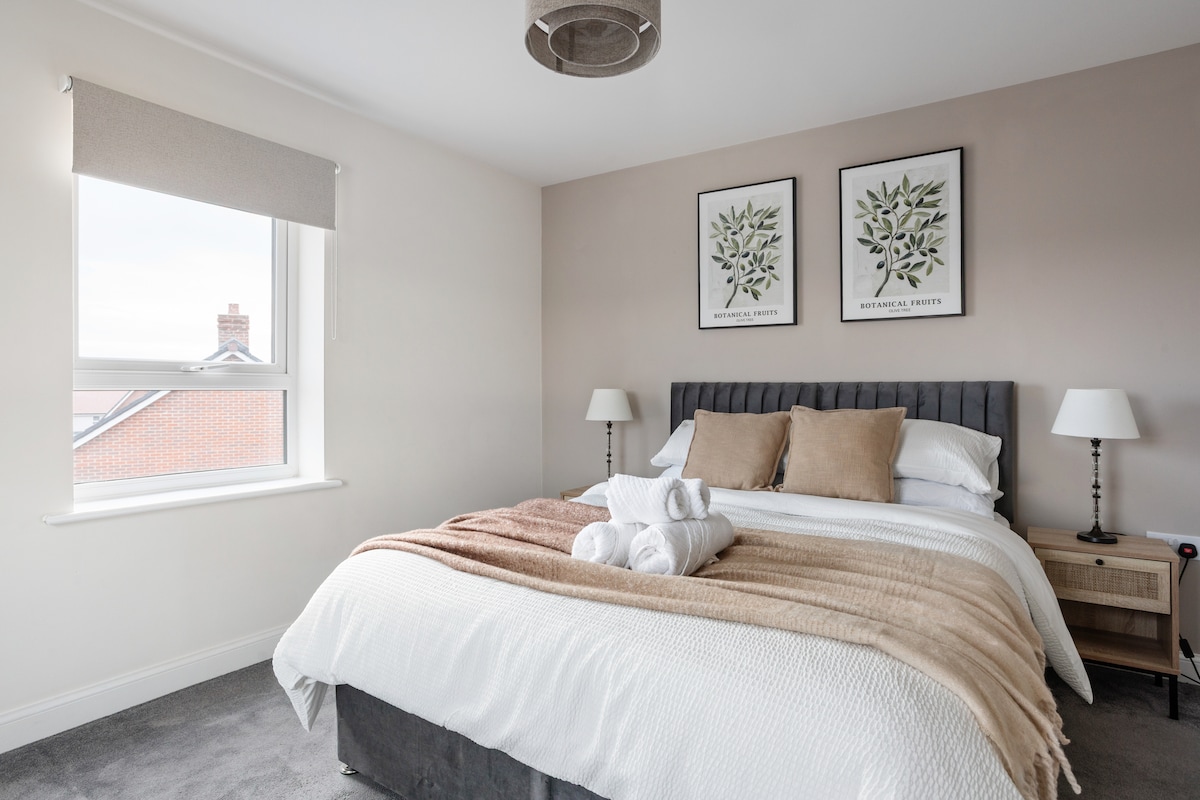 Our Kandy Suite (sleeps up to 6) is a stylish, contemporary second-floor apartment with Free Parking (1 vehicle) access to fantastic on-site amenities including a Gym, Yoga Studio, Cinema Room (booking required), Outdoor Area and Communal Lounge. Perfect for Contractors, Families, Leisure and Business guests. It’s set in the heart of Bedford town centre—just a short walk to shops, restaurants, pubs, the River Great Ouse and attractions, with excellent transport links nearby