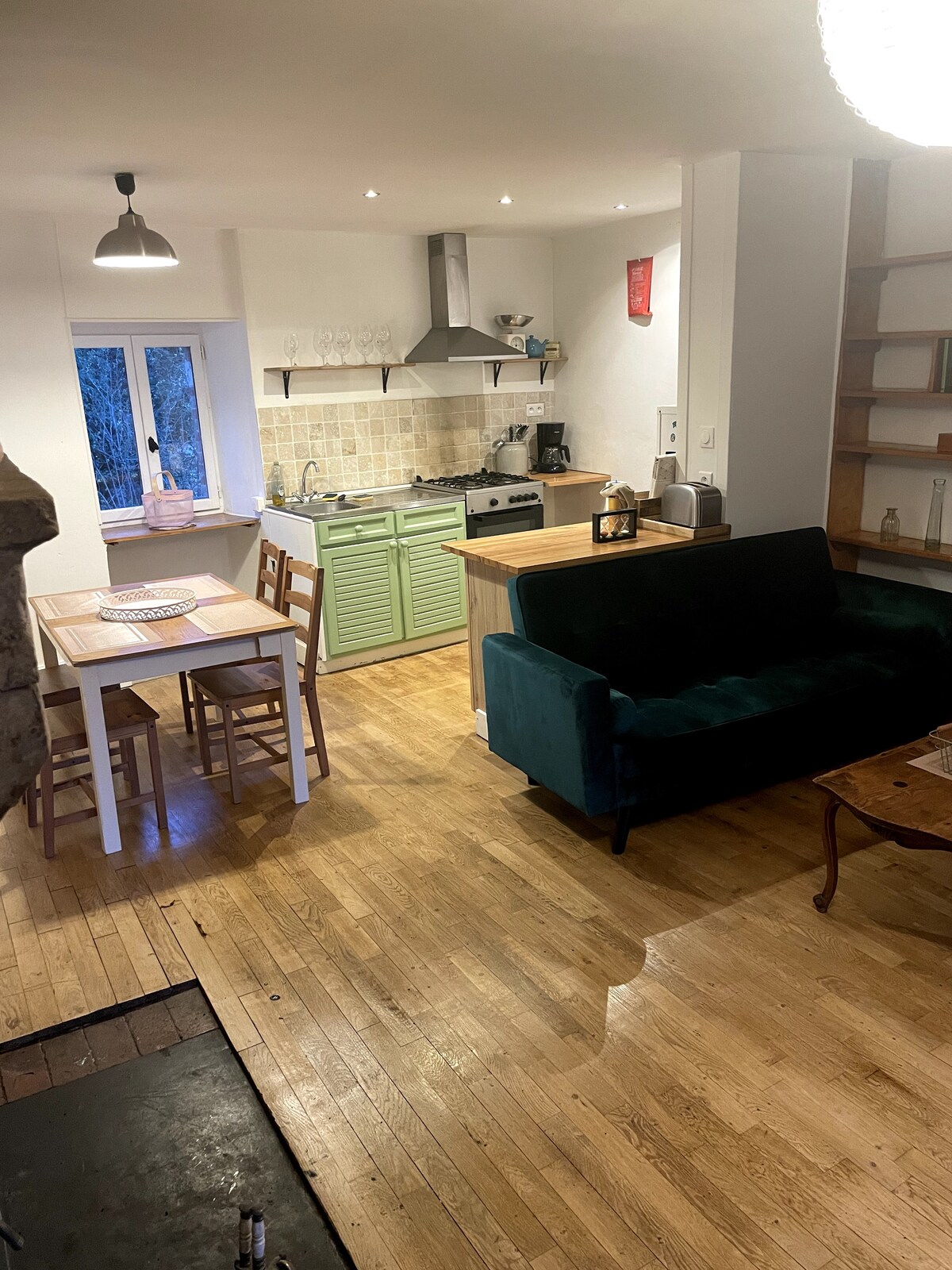 Cool, comfortable and spacious (90m2) home on 2 floors. Large kitchen , lounge and terrace on street level and fabulous 1 double bedroom open plan room on the 2nd floor. A converted grange perched on a mountain in a medieval village 16 minutes from the A6, this peaceful home makes an ideal stop over for holidays in the Alps or south of France. Please note - there is a studio apartment with its own entrance on the lower ground floor - rented separately.