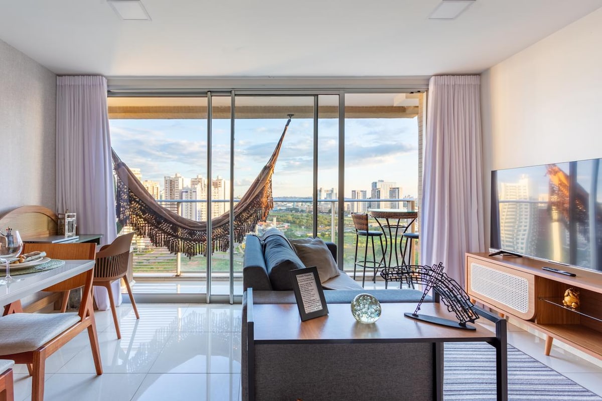 This flat with a lake scenery is ready to make your stay in the capital unforgettable! Situated just 5 minutes from "Esplanada", the apartment offers the perfect balance between centrality and the tranquility of nature by the lake. Additionally, our resort features a range of amenities: two beautiful infinity pools, a jacuzzi, sauna, gym, three coworking spaces, a 24-hour convenience store, 24-hour laundry, and an elegant pier by the lake with a view of the JK Bridge.