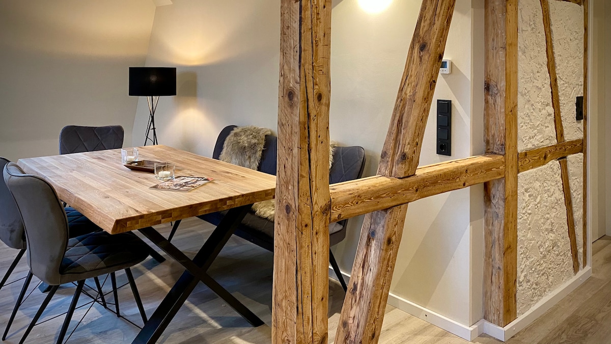 Furnished with a lot of love and equipped to a high standard, the 95 m² apartment has fully equipped kitchens and many extras. Up to 5 guests have enough space to relax and spend time together by the wood-burning stove. Modern technology and wooden beams complement each other to create a harmonious temporary home for an active or relaxing holiday in the Harz Mountains.