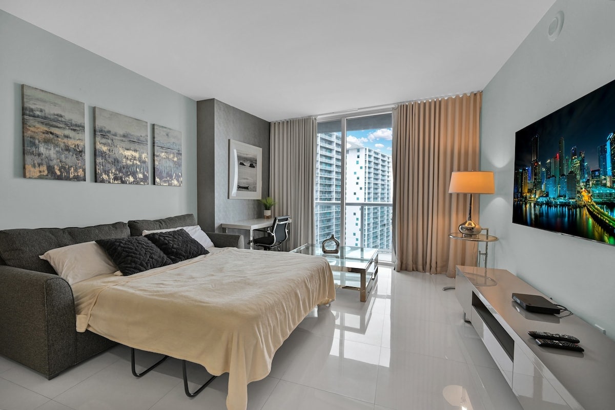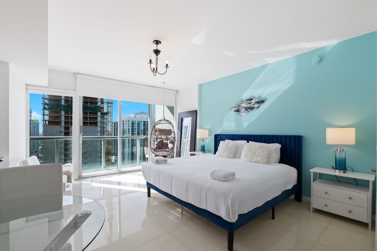 Enjoy this centrally-located Penthouse (42nd floor.high ceilings) in the heart of Miami. Mins 2 Bkll City Center, Beaches, Design D, wynwood, n Best restaurants.Tastefully Remodeled n Furnished, Sparkling CLEAN, BRIGHT, modern 1bed 1bath w Amazing CITY VIEWS n Partial Ocean views. Fully equipped Kitchen, Laundry, Cooler n Beach Chairs. King bed n Sofa b. Smart darkening Shade 4 Long nights.Smoking, Pets n Events NOT allowed. Guest must send identification n e-mail to sign registration.