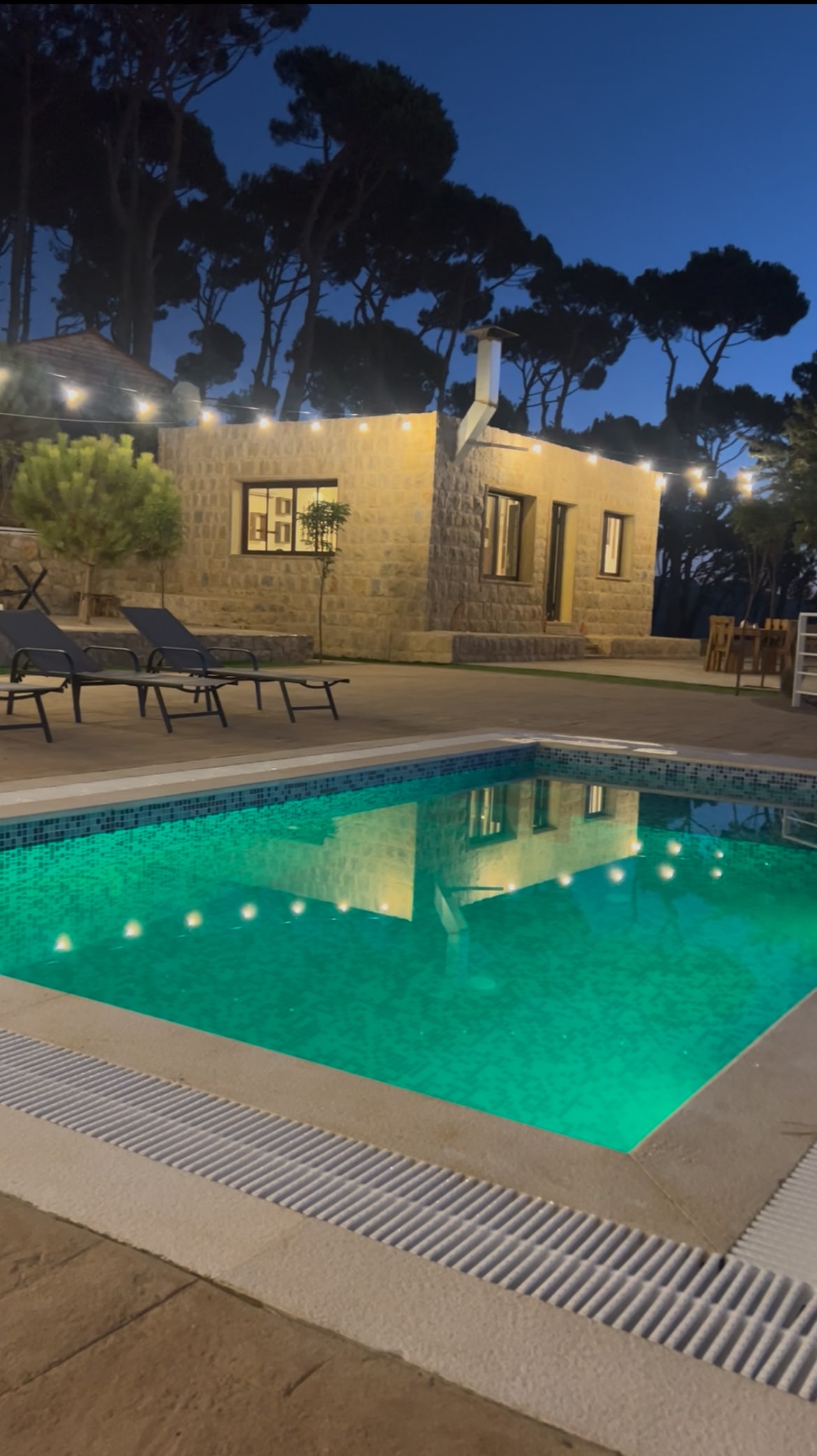 Escape to Nature with Style Welcome to your private retreat nestled in the heart of the Barouk Cedars.Ideal for couples or families,offering the perfect mix of nature,comfort and luxury - 1Bedroom - Indoor Jacuzzi - Swimming pool - Sunset views - Kitchenette - Ac - 24/24electricity - Outdoor BBQ, & garden - Music allowed - Bonfire(Extra Costs Involved) Step into a cozy living space,relax under the stars in your jacuzzi,or fire up the BBQ while enjoying breathtaking views across the mountains