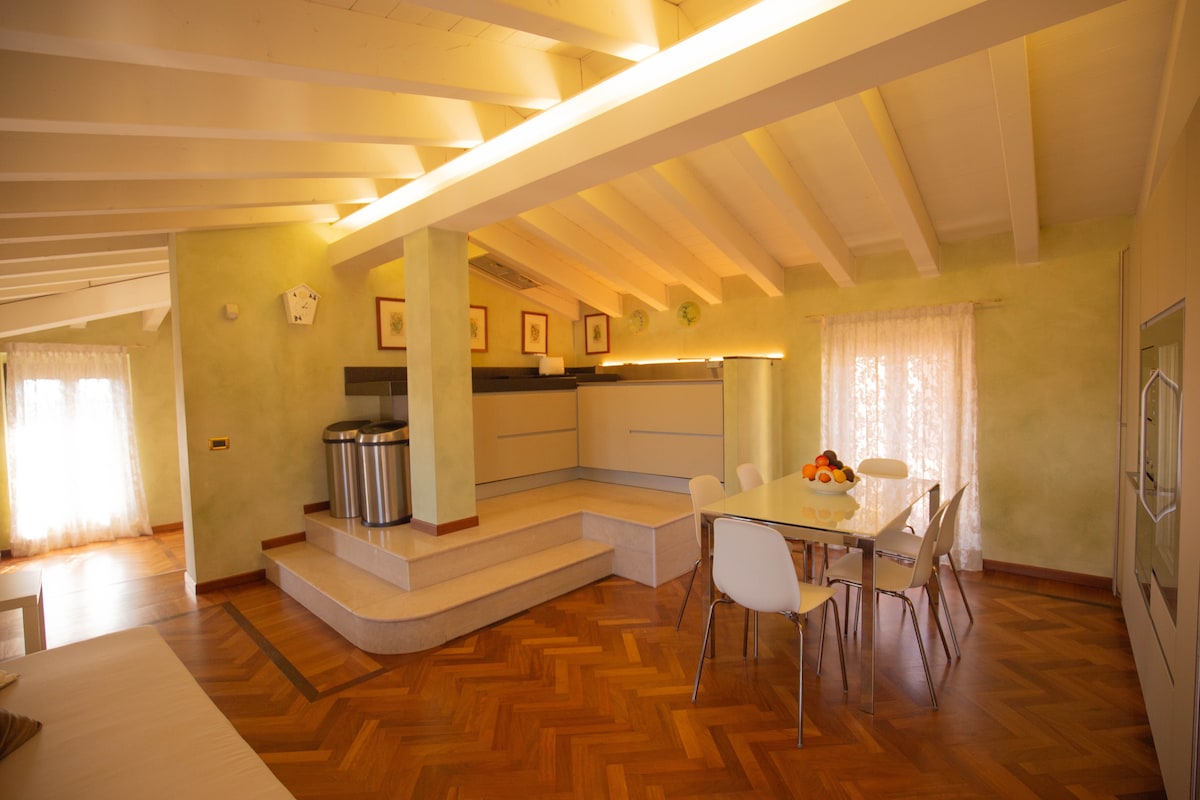 Just 100m from the lake, with private outdoor parking. Located in the historic center of Rivoltella (Desenzano Del Garda), a few minutes walk from all services, restaurants and bars. The one-bedroom apartment, situated at the second floor (no elevator) is large and spacious (75m²), with an open-space kitchen-living room and a mezzanine. Equipped with 2 Air Conditioners, a 55" Smart TV, fast WI-FI and an office desk, making your staying very comfortable.