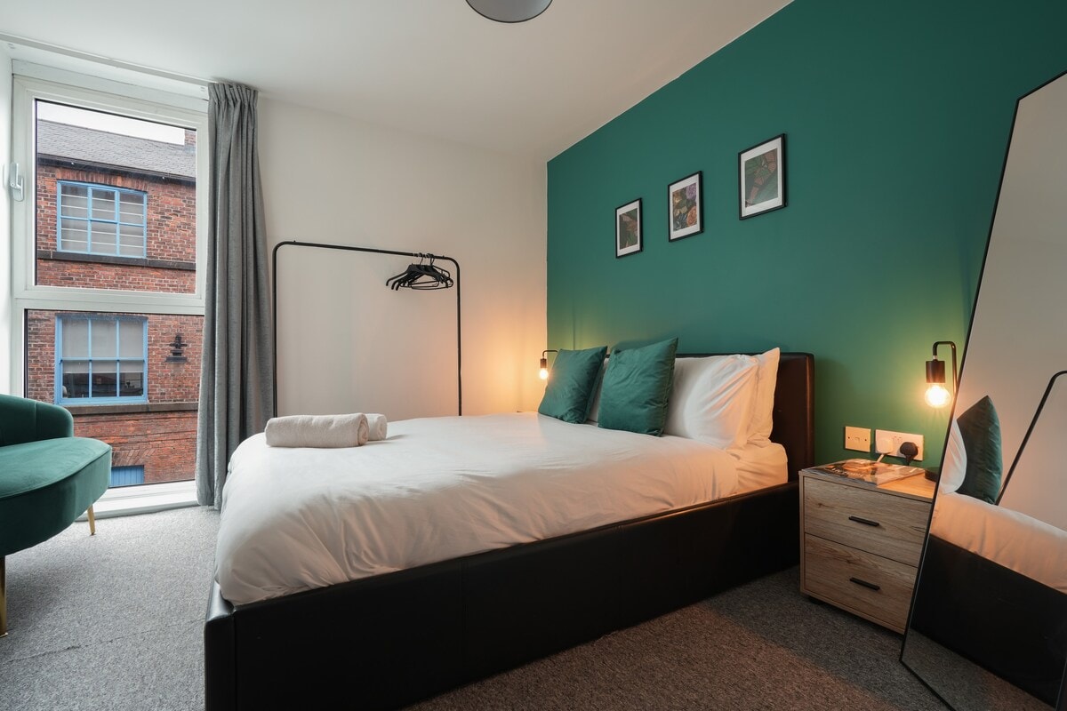 An impressive, stylish, and modern large two-bedroom apartment at the heart of the much sort after Sheffield City Centre. With a king size, on-suite bedroom and a double-bed bedroom. This is certainly an entertaining space for a stay with friends, colleagues or family, right next to everything Sheffield city has to offer. Two large bedrooms | Bigger kitchen | Bigger living room | Large clean showers | Massage chair | Great 65" TV, Prime, Disney, NetFlix, Fibre WIFI, Audio & more.