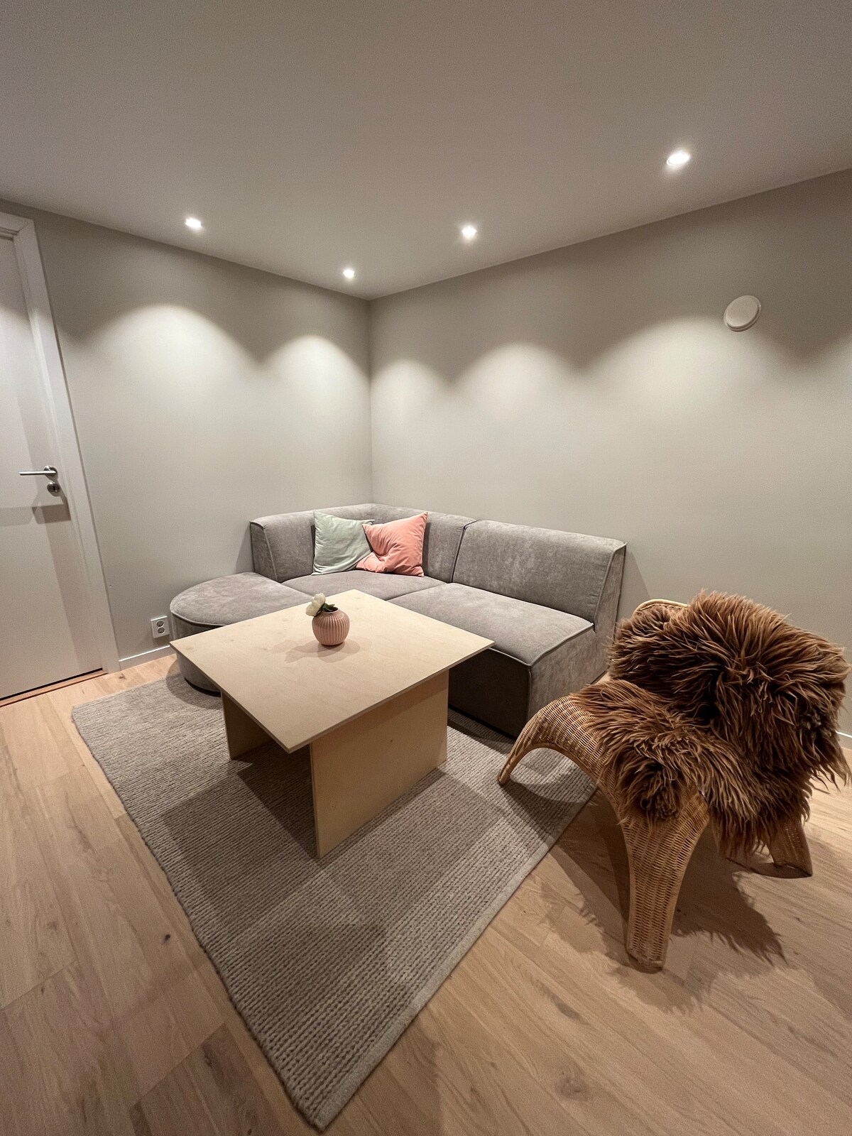 New and modern apartment with a sheltered and nice terrace/garden. Located in a quiet residential area with very good bus connection to the city center (5 minutes to bus stop). 1 parking space. Walking distance to NTNU. The apartment is suitable for short-term stays, but also for longer periods. Bedroom with double bed, with the possibility of 2 extra beds.