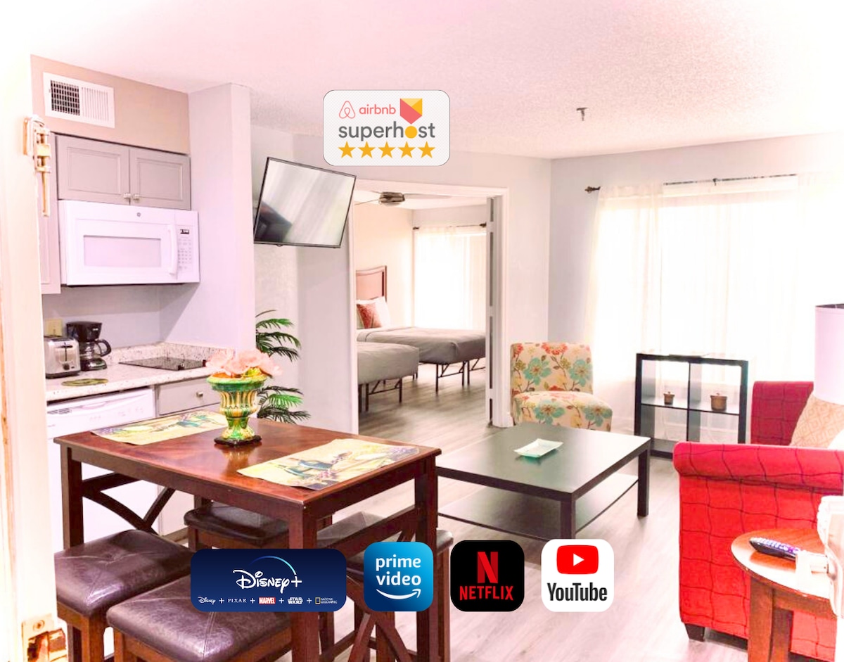 Welcome🌞! This unit is on the third floor with elevator! Your deserved fun vacation away from home starts here 😎! Llocated in the heart 💗 of Walt Disney World and all Kissimmee and Orlando best fun spots 🎢! Includes 2 full size bed. and 1 Full size sofa bed. Just added BIG SMART TVs with Disney+, Netflix, Amazon Video perfect for relaxing after a fun-filled day.✨ 🚗 NEED A CAR? Ask us about our 8-passenger minivan. You can plan your stay and car rental all in one go. Ask us for the link!