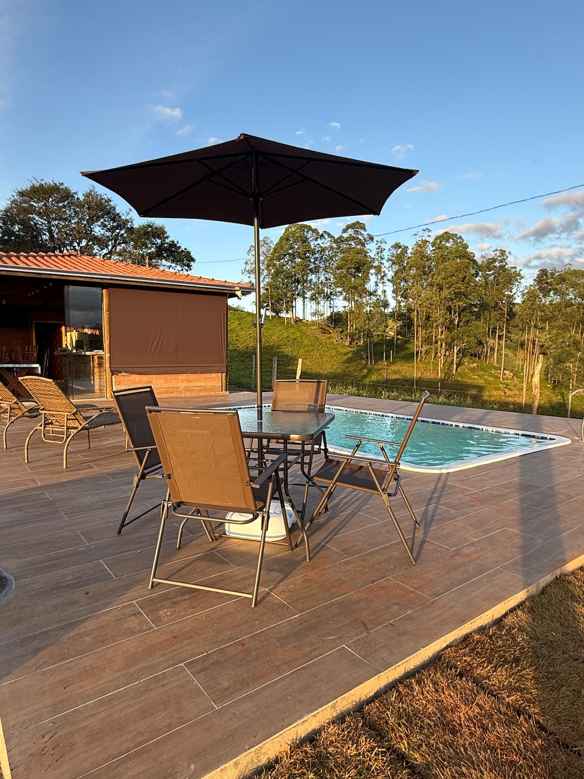 Refúgio romântico em meio à natureza, ideal para casais. Chalé estilo suíço (A-frame) em sítio cercado por cafezais, com rio e cachoeira particulares. Possui banheiras externas com vista para a Serra da Mantiqueira, jacuzzi interna, fogueira, churrasqueira, quadra de beach tênis, cama-balanço, sauna seca com vista e projetor interno com telão de 100”.