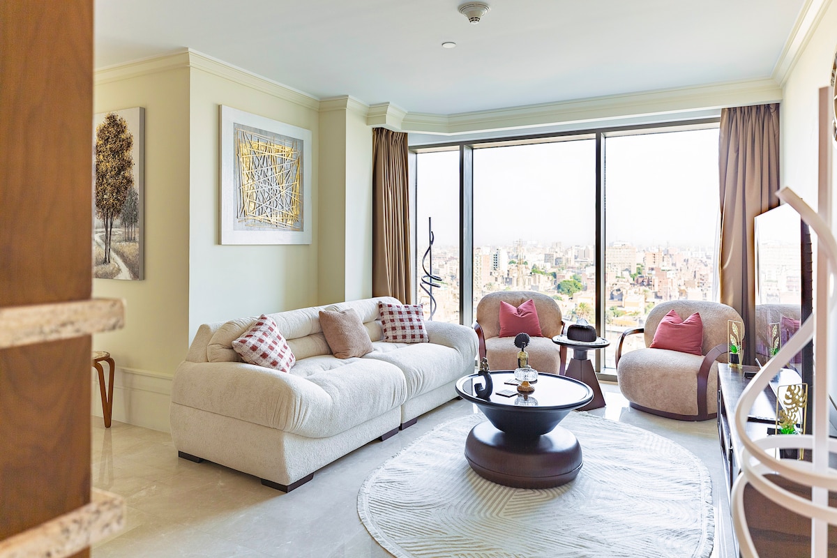 This Apartment is Offered By Dhbstays , The 2-Bedroom Partial Nile View suite at the St. Regis Hotel offers an blend of luxury, comfort, and breathtaking views. With two elegantly appointed bedrooms, this suite is designed for both relaxation and sophistication, making it ideal for families or those seeking extra space. Floor-to-ceiling windows frame panoramic views of the iconic Nile River, offering a serene and picturesque backdrop.