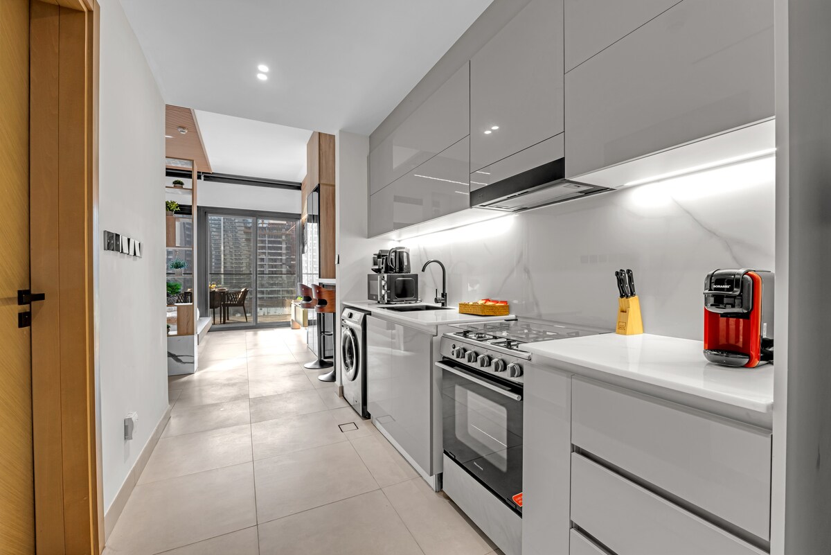 Experience Dubai from the prestigious Binghatti Canal, with a unique view of the Burj Khalifa. The flat can accommodate up to 3 guests and features a double bedroom, living room with sofa bed and Smart TV, modern kitchen with dishwasher and Nespresso machine, bathroom with shower and washing machine. A panoramic swimming pool, gym, fast Wi-Fi, 24/7 security and private parking will make your stay comfortable and unforgettable.