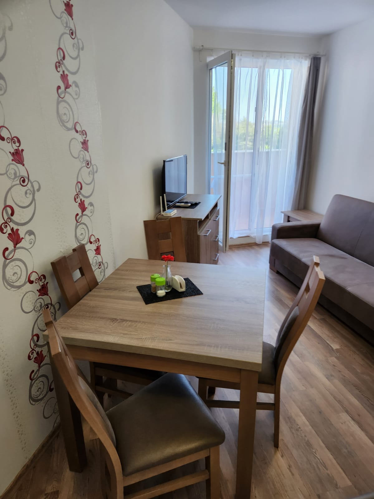 Apartment D102 of 2 sqm, located on the ground floor overlooking the park. The apartment offers a bedroom with a double bed, bedside tables and a wardrobe, a living room with a sofa bed and an LED TV with access to the garden or balcony, where you can also sit comfortably. The kitchen is equipped with a fridge, glass ceramic hob, microwave, toaster and kettle. The bathroom is equipped with a shower, sink and toilet. For comfort, the apartment is air-conditioned.