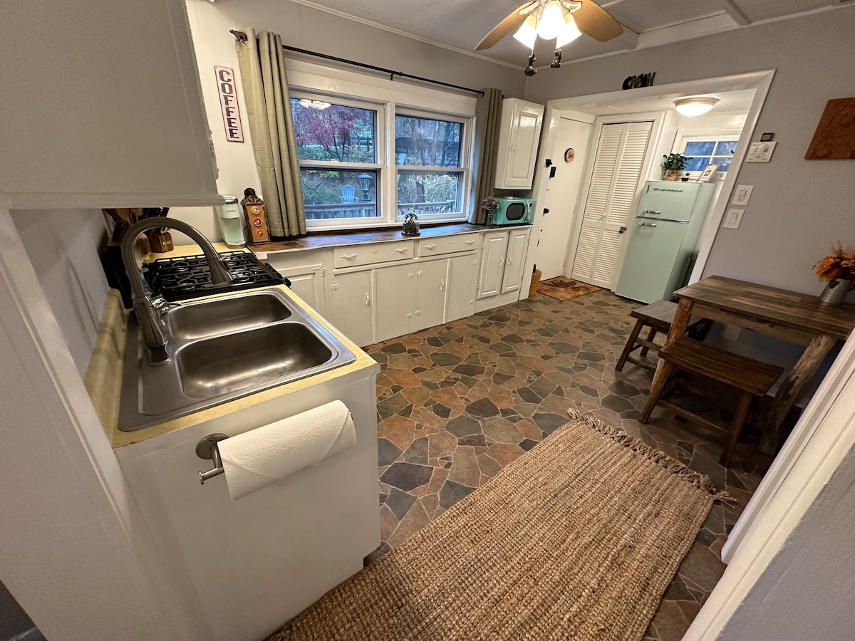 The brook flows through an evergreen forest creating a nourishing environment and the perfect setting for a relaxing and rejuvenating spa retreat. The living/dining room, hot tub/deck, and gas fire pit are set overlooking the cascading brook, ideal for entertaining, meditating or simply as an enjoyable natural muse. The soft, cozy and elegantly vintage styled interior is illuminated and warmed with central heating, ambient lighting and a home surround sound entertainment system with karaoke.