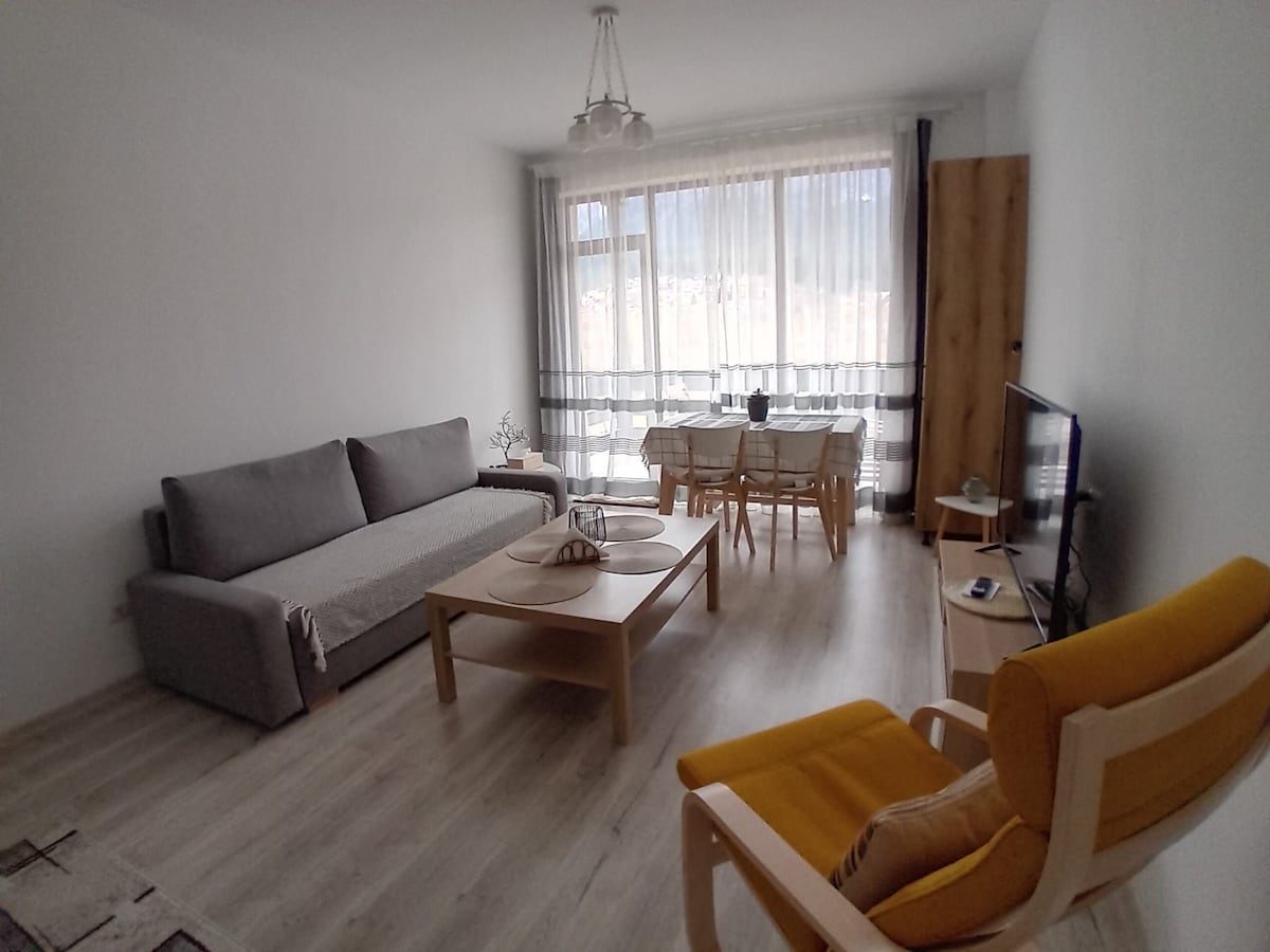 Welcome to our charming apartment situated next to the Prahova River where you can enjoy breathtaking mountain and river views that provide a sense of peace! Each room features a TV, ensuring entertainment, while the fully equipped kitchen easily covers your culinary desires. Take a well-deserved shower in the modern bathroom after a long day of exploring Busteni, and you'll never want to leave.