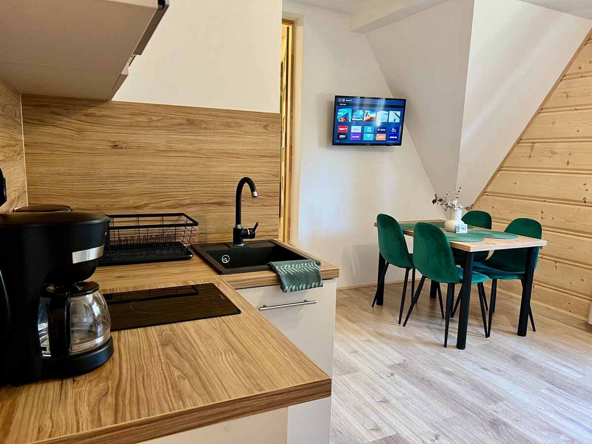 A 33 sqm shelter house studio with a balcony in a protruding dormer window, with a beautiful view of the Western Tatras. Spacious, 4-meter interior finished with larch wood. King size bed 180x200 cm with the option of splitting into 2 singles. Kitchenette with dishwasher, fridge, microwave, toaster, coffee maker. A 100 cm wide sofa bed makes the studio comfortable for 2 people or 2 people with a child. Open space bathtub, toilet with sink in a separate room.