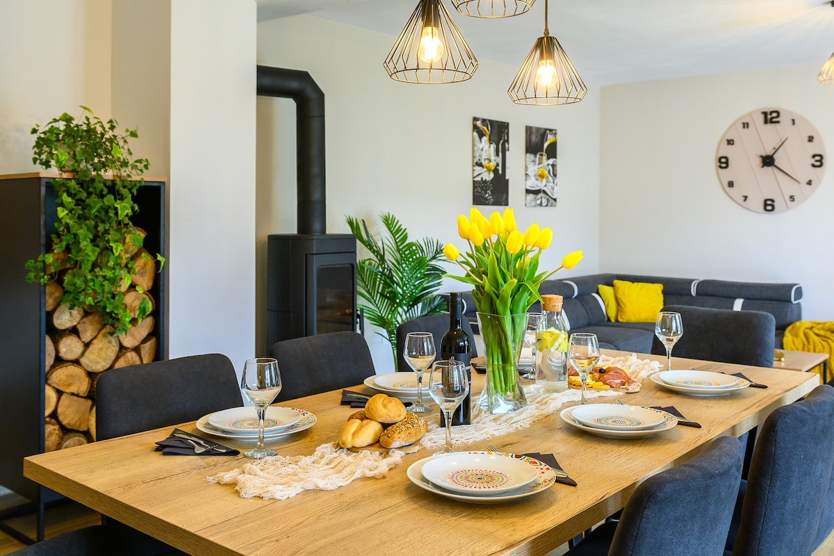 The cottage was primarily intended for families to enjoy and for hosting friends by the fireplace, good food, wine and fire. That's why it has a big table and benches. We decorated it to our liking, all the furniture is made of wood. When decorating, we were not guided by the fact that everything must be harmonized and that it should be beautiful, comfortable and functional. As we came up with the idea that we could rent it out, we hope that all the guests who find themselves in it will be just as beautiful and comfortable.
