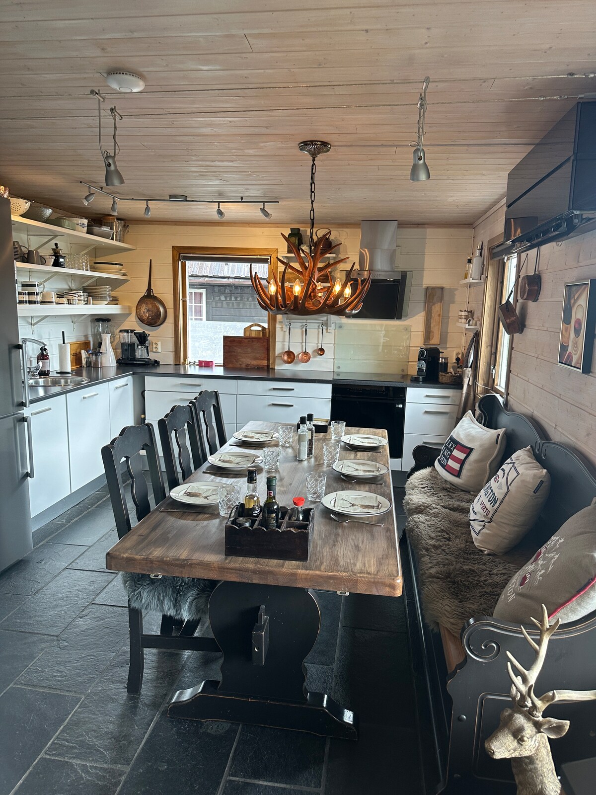Nice cabin in scenic surroundings. The cabin has unspoiled outdoor spaces, great views and parking right outside the door. Electric car charger in the garage. The cabin has 4 bedrooms and 2 bathrooms, plus an extra shower in the laundry room. Groomed ski slopes below the cabin. Large alpine resort and water park are about 15 minutes drive away. Electricity and wood are included in the price. You are most welcome!