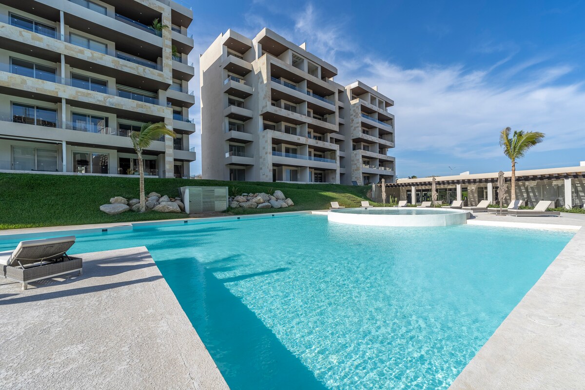 - Sweeping bay and Arch views from your private wraparound terrace: perfect for morning coffee or sunset cocktails. - Tennis courts, climate-controlled pool, and fully-equipped gym. - Two spacious bedrooms sleep 6 comfortably with a dedicated workspace, full kitchen, and in-unit washer/dryer. - Walk 5 min to Costco and Soriana for easy grocery runs or visit the marina restaurants and nightlife. - Reserve now for a serene retreat with all comforts and a welcoming host!