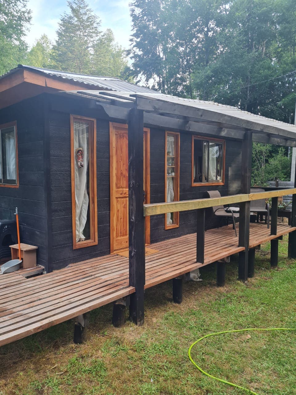 The cabin has a natural feel and rustic touch within amazing surroundings of the native forest and trees all around you. The cabin has been built with native and sustainable wood. it is well equipped. Is very cute and cozy space with a large veranda with an outdoor seating. There is a nice river with access within the property with a picnic table next to it to enjoy listening the river. Big sunny green garden, picnic table to enjoy the view of the mountains, a fire-pit and couple of hammocks.