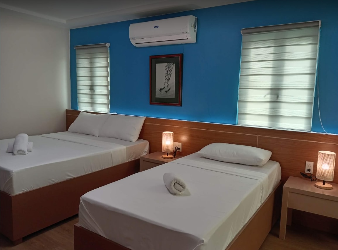 Comfortable room for up to 3 guests with 1 queen bed and 1 single bed. Includes Smart TV, fast Wi-Fi, and private bathroom with hot & cold shower. Located in the town center near market, church, and Puregold. Street parking available.