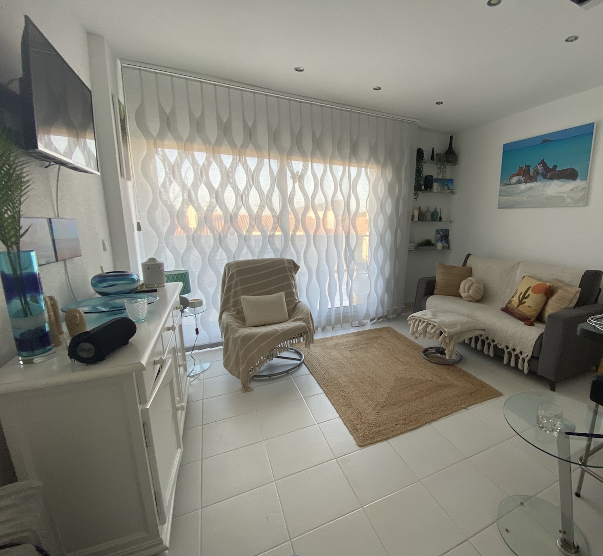 Stylish Pet Friendly 1 Double bedroom apartment with balconies .Light and airy space with WIFI, Smart TV and Fully functional kitchen. Large private use solarium with sea and mountain views, sunbeds. Use of communal pool. Local bars, beaches, dog friendly beach approximately 600 meters away. Nestled in a typical Spanish seaside pueblo. Paseo Maritime de Puerto de Mazarron within walking distance. Summer season Water-sports available, beach bar. Historic town of Cartagena is 50min drive away.