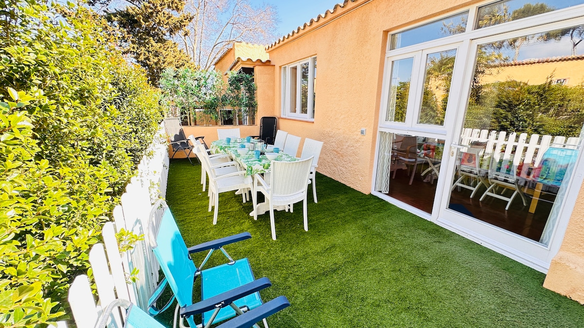 SHARED GARDEN WITH 6 OUTDOOR HOT WATER SHOWERS AND 4 TOILETS. 60 m2 house with a 24 m2 fenced terrace at the entrance of the house, with tables and chairs for 8, sun loungers and barbecue, 40 meters from La Fosca beach. Living room with a sofa bed, TV, dining room for 6. The house has two bedrooms, 1 with a double bed and 1 with 2 bunk beds and a sofa bed, a full bathroom, a shared garden of 3,500 m2. where they can park 1 car.