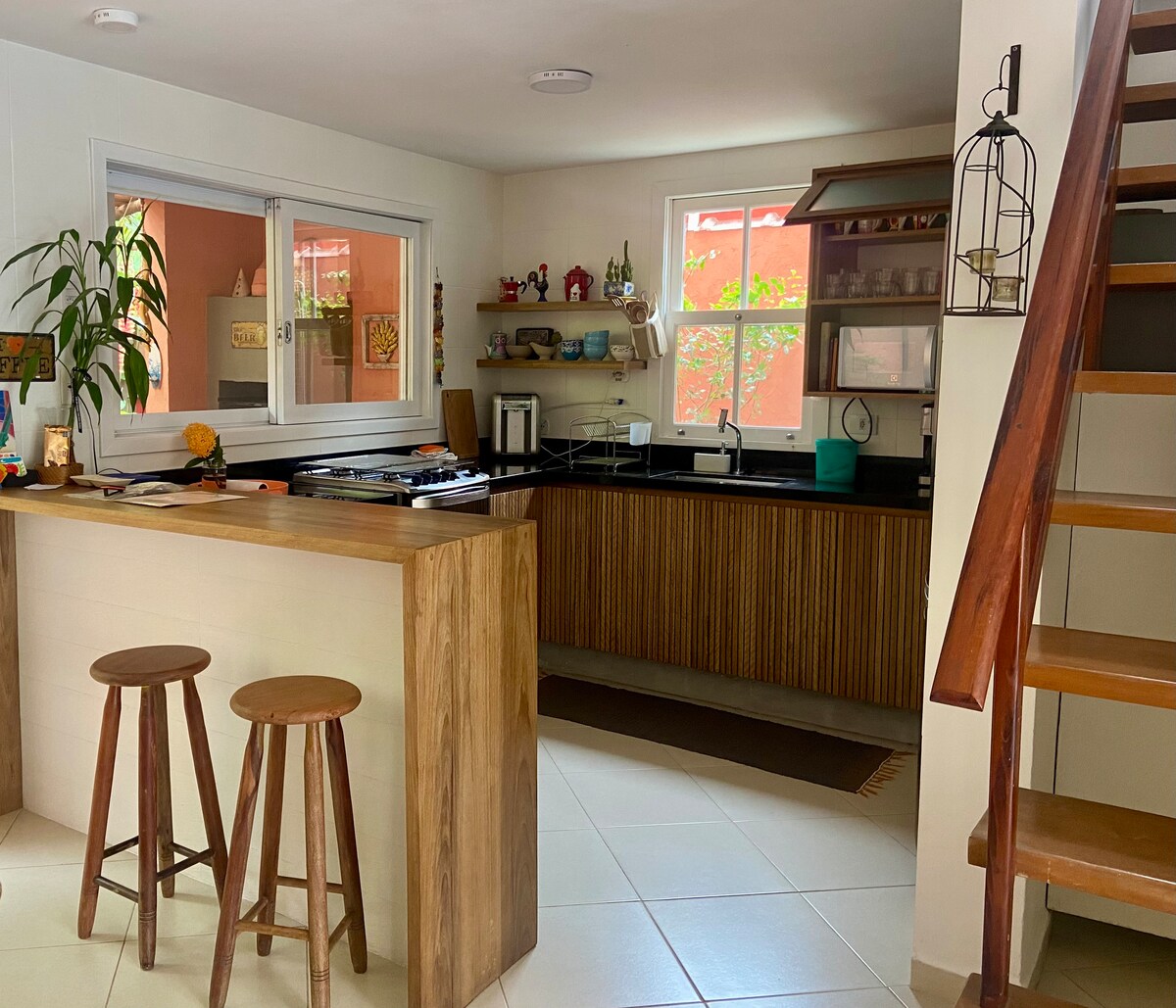 A poucos passos da praia, esta casa tropical cercada por grande jardim é um refúgio perfeito para famílias. Com 4 dormitórios, a casa acomoda até 10 pessoas. Há suíte no térreo, ideal para idosos ou pessoas com mobilidade reduzida. Todos os ambientes têm ar-condicionado, inclusive a cozinha, e a sala conta com lareira aconchegante. Os espaços externos são destaque, com terraço coberto, mesa grande, sofás, redes e churrasqueira, além de jardim tropical iluminado à noite.