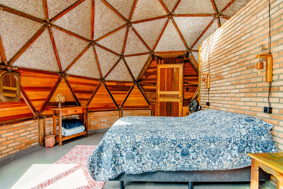 The Surya Geodesic Dome is located in Saramandala, a privileged place in a quiet neighborhood in a rural area. Great for relaxing, resting and connecting with nature. Possibility of HomeOffice as well. Option of hosting on weekends/holidays and seasons. Come and have a unique experience in a building that is in tune with Nature, representing Sacred Geometry and favoring the harmonic flow of energy. Only those who have been to a Dome know what I'm talking about.