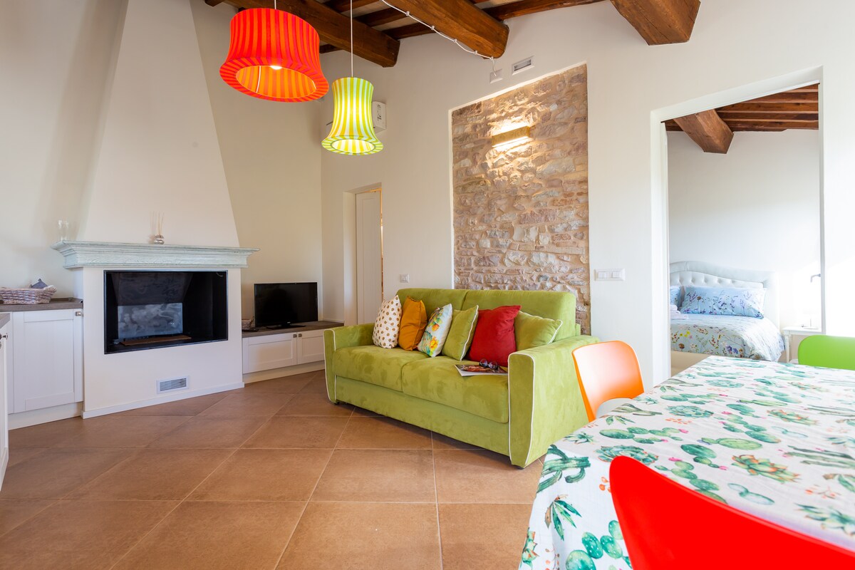 The apartment is on the second floor of a hillside farmhouse. It consists of a double bedroom, a double bedroom with a French bed, a bathroom and a large open space with a kitchen and living room. It is nestled among the lush green hills of Umbria and surrounded by a lush garden. The apartment is on the first floor of a typical country house. It is composed of 1 double bedroom, 1 small double bedroom, 1 bathroom and a large open space with kitchen and living room. It is surrounded by green hills and a garden.