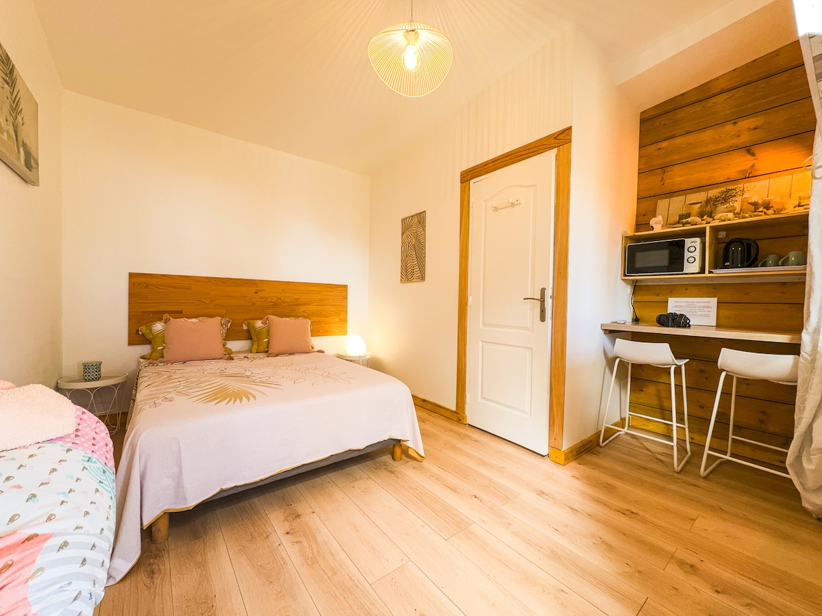 Large T2, very well-equipped You will have a spacious bedroom equipped with a double bed, adjoining a bathroom with walk-in shower. On the cooking side, you will have everything you need to prepare the dishes of your choice. Internet / office area Parking facilities in a fenced yard. Terrace and garden area accessible. Washing machine.