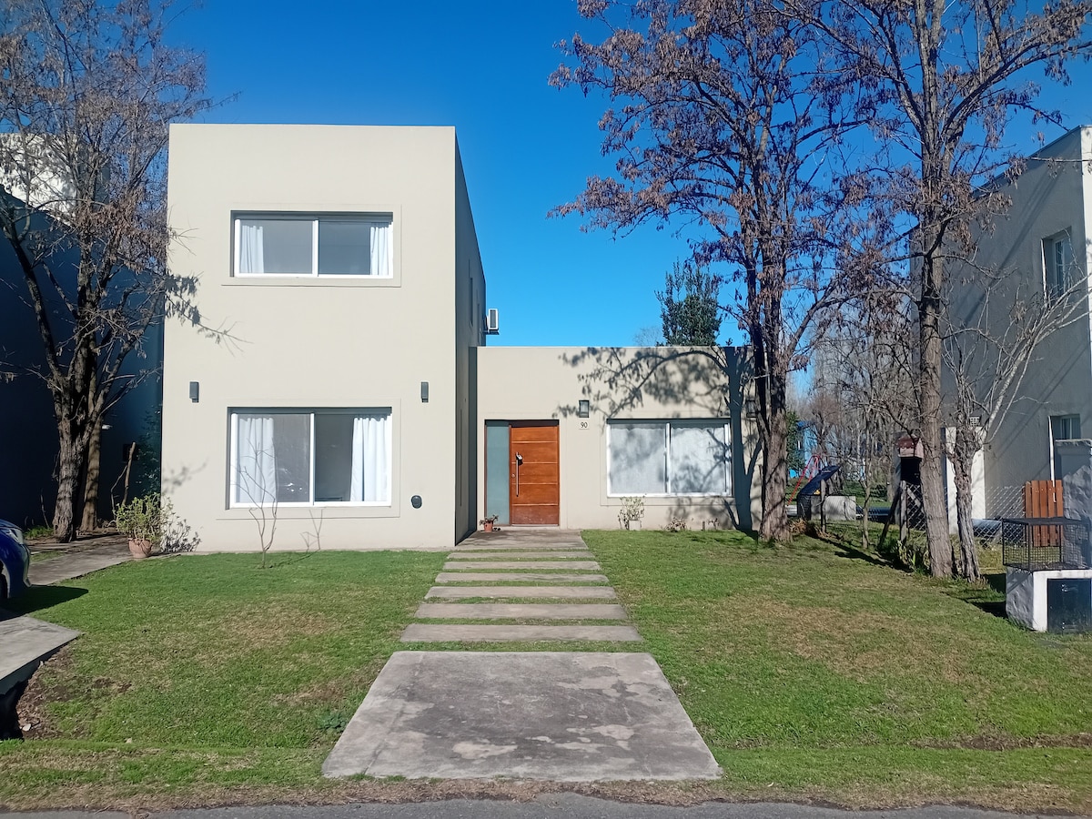Single-story house, bright and functional, perfect for relaxing. Located in the exclusive gated community of Tessalia, in the heart of Argentina's polo region, Paraje Ellerstina, and just 50 minutes from Buenos Aires. The house features over 1,000 m² of private garden, an organic vegetable garden, a compost bin, fiber optic Wi-Fi, air conditioning in every room, and linens included. Pet-friendly: we welcome dogs! Follow us on @casaaguaribay