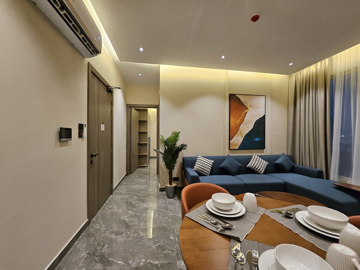 Enjoy a stylish experience at this centrally-located place. 1 bedroom with living room and 1.5 bath in the most luxurious area of Bahrain, good for 4 people, the sofa in the living room can be converted into a bed. gym, swimming pool, private parking with a stunning sea view